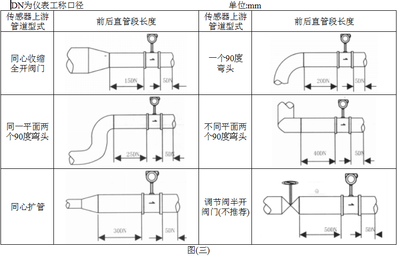 1. 渦街流量儀表對安裝點的上下游直管段有一定要求,否則會影響介質在管道中的流場,影響儀表的測量精度。儀表的上下游直管段長度要求見圖(三)